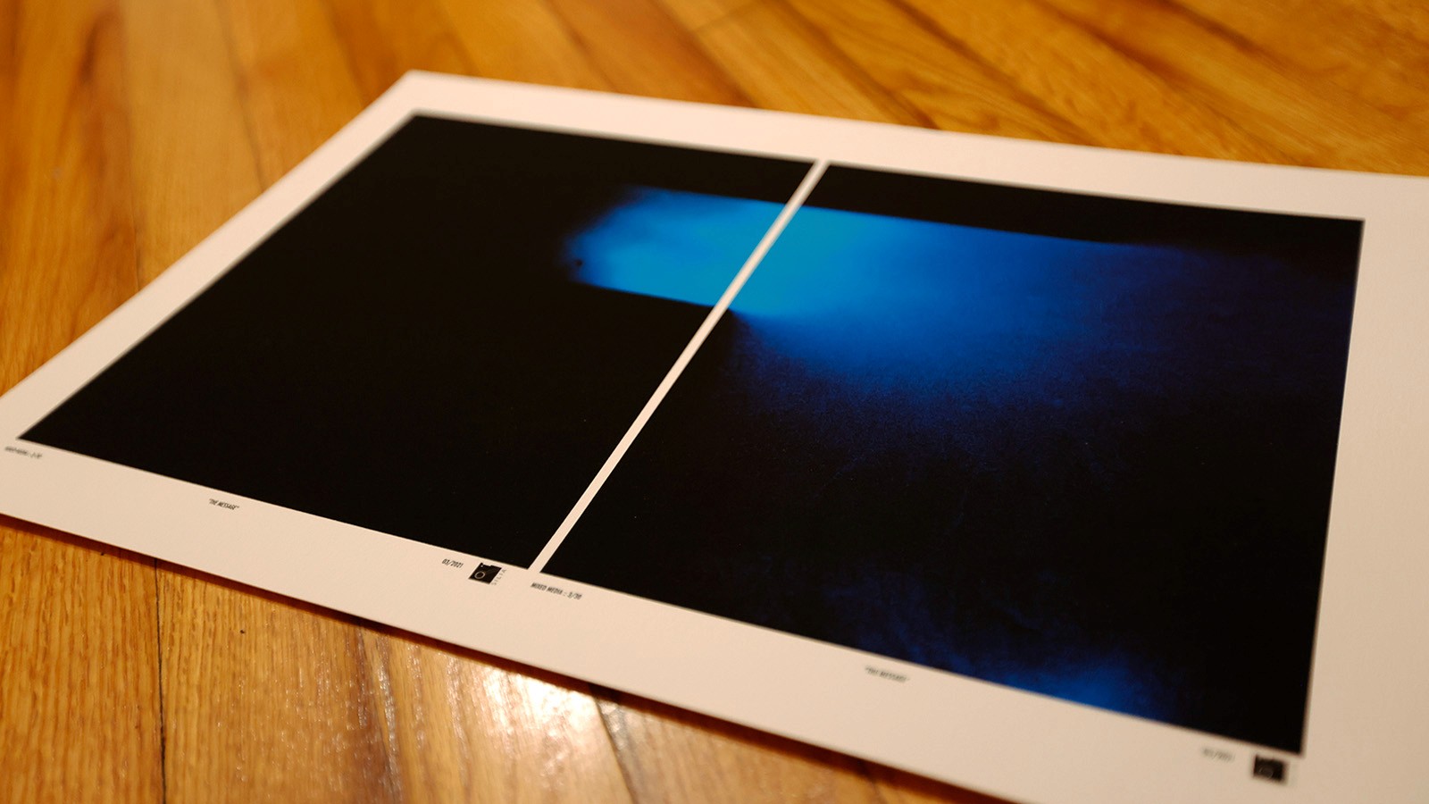 The Message is a diptych art piece reflecting on light, transcendence, and spiritual connection through symbolic messages.